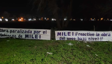 Este lunes Junín amaneció con pasacalles colgados en diferentes puntos de la ciudad en los que se le pide al Presidente la reactivación de obras por parte del Gobierno nacional. “Obra paralizada por el gobierno de Javier Milei” y “Milei reactive la obra del paso bajo nivel” son algunas de las leyendas que cubrieron los espacios de esquinas y calles de la ciudad.